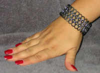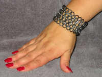 Titanium and rubber bracelet knitted with 3 rows of rubber and 2 rows of titanium. Rings are all 5/16" X 1/16". If you have metal allergies, this is a cool accessory that won't cause you to break out and won't break the bank. Available in a variety of colours. This item is featured inChain Mail Jewelry. Five Row Rubber and Titanium Bracelet: $20.00 |