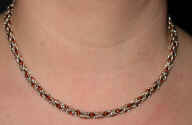 Sterling silver double-knit cable chain, 1/8" dia. loops. Unlike a normal hard ring, these move and give with you. They feel like a living ring. If you can't wear rings at work because of a crushing or catching hazard you can safely wear these. The joints in each loop are butted instead of soldered; if a machine grabbs your finger by the ring, the ring would break loose instead of the finger. Available in sizes 5, 6, 7, 8, 9 1/2,10 1/2, 12 1/2 Price: $14 ea. |