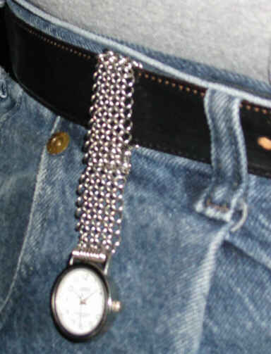 This used to be a wristwatch! The body is stainless steel, and the 1/8" rings are 316L stainless. No two watches are the same, as I pick up only one or two that I find pleasing to look at and functional to use. This watch is made such that it's right-side up to the world, upside-down to the wearer. When ordering, let me know which way you'd like it. I can make the chain in pretty much any knit style you see above in the jewelry knits, and in pretty much any material you like. For a dressier look, go for a King Chain with giant lobster clasps in 14K gold-filled. A working watch, like that shown here, looks great in stainless with a knitted-in belt-loop. Price: About $40 - $60 Have a nice watch with a bad band? Want it converted? E-mail me and I'll quote you a price for exactly what you want. |